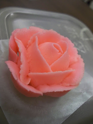 thrown out of a 10 story building (sorry, to all the clowns that read my blog). Had I colored some frosting red I would have went to town with the whole display, but instead I just scooped him up and threw him back into the container to mix in again. But roses I like, so here are a few pics that I took at the end of class...